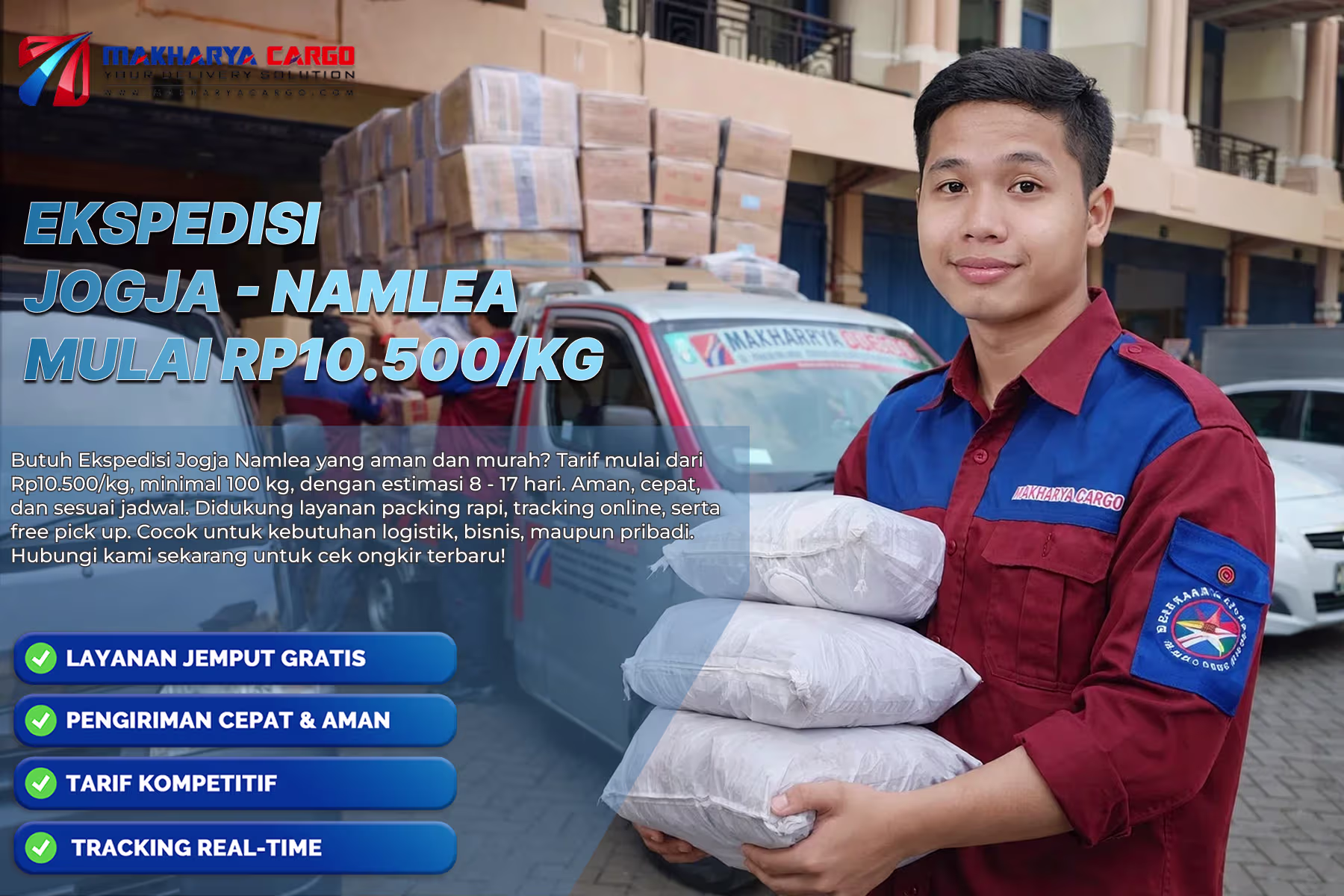 | Jogja → Namrole | Kapal Cepat | Rp18.000 / Kg | 100 Kg | 8 – 10 hari |
